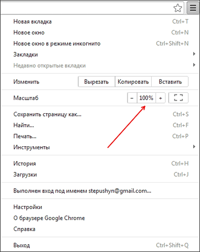 В браузере Google Chrome это можно сделать в основном меню программы. Для этого достаточно открыть основное меню (кнопка в правом верхнем углу программы) и нажать на кнопку «+», если вы хотите увеличить шрифт, или на кнопку «-», если вы хотите уменьшить шрифт.