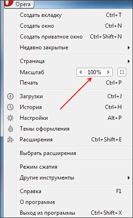 В браузере Opera шрифт увеличивается и уменьшается аналогичным способом. Откройте меню программы (кнопка «Opera» в верхнем левом углу) и используйте кнопки «+» и «-».