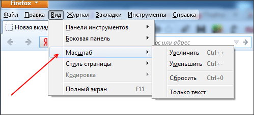 В браузере Mozilla Firefox для того чтобы уменьшить или увеличить шрифт необходимо нажать на кнопку ALT на клавиатуре и после того как появится меню, открыть «Вид – Масштаб». Здесь можно будет увеличить, уменьшить или сбросить размер шрифта.