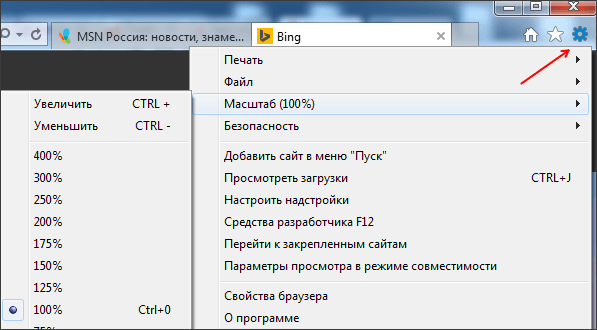 В браузере Internet Explorer для того чтобы уменьшить или увеличить шрифт нужно открыть основное меню программы (кнопка в правом верхнем углу программы) и выбрать пункт «Масштаб».