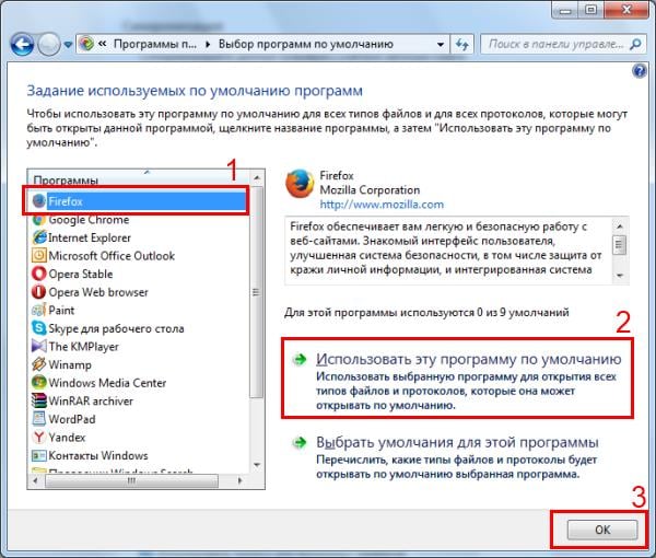 - Находите в списке слева Firefox, выделяете его, нажимаете «Использовать эту программу по умолчанию», а затем кнопку «ОК».