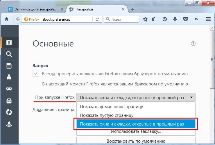 Дело в том, что по умолчанию после выхода из браузера и его последующего запуска показывается домашняя страница Firefox. А все открытые сайты пропадают. Конечно, их можно восстановить через журнал, но это неудобно. Да и зачем, если есть вариант куда проще.