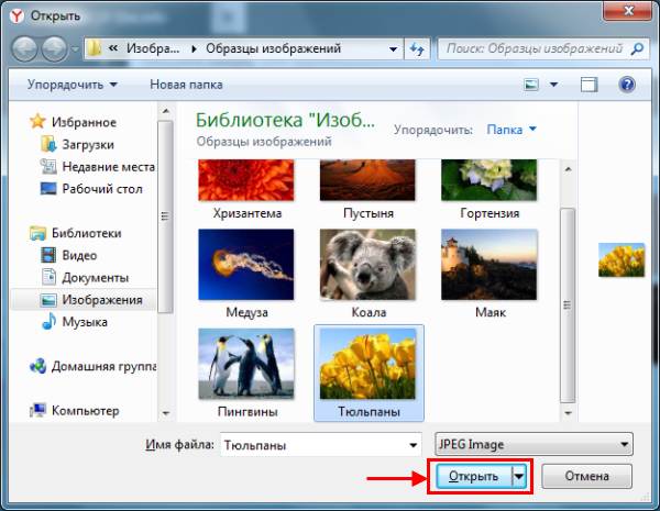 - Откроется новое окно: укажите путь к изображению и нажмите «Открыть».