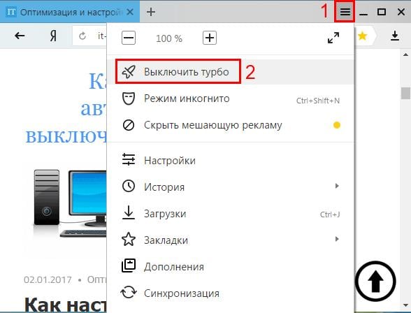 Первый – нажать на 3 полоски и выбрать пункт «Отключить Турбо». Значок ракеты в адресной строке исчезнет, и данная опция будет выключена.