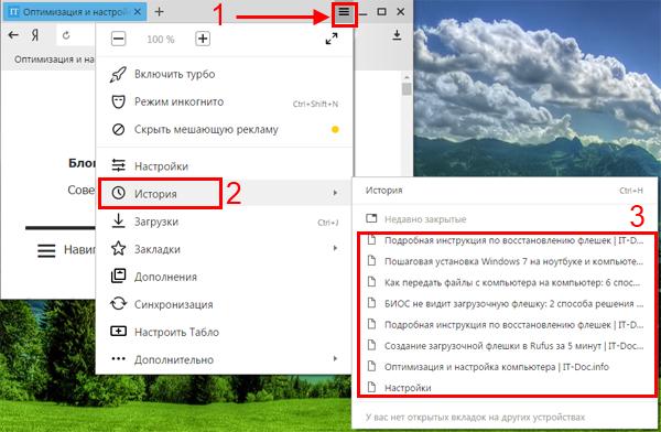 Что делать, если в списке «Недавно закрытые» нет нужного сайта? Для таких случаев существует еще один метод, с помощью которого можно восстановить предыдущие вкладки в Яндекс Браузере.