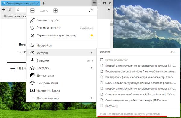Кстати, здесь же, чуть ниже, могут отображаться веб-сайты, которые Вы открывали на других устройствах (смартфоне, планшете или ноутбуке). Но только при условии, что они были синхронизированы с аккаунтом Yandex. В противном случае будет вот такая надпись: