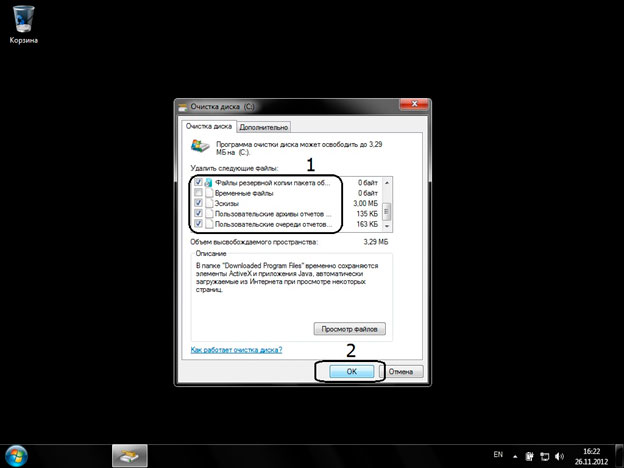 Для этого нужно открыть меню «Пуск». В нем пройти в «Программы» >> «Стандартные» >> «Служебные». В открывшемся списке следует найти пункт «Очистка диска». Вам будет предложен выбор очищаемого раздела жесткого диска. По умолчанию выбирается системный раздел C. Поэтому сразу нажмите кнопку «ОК» и ждите, пока Windows соберет сведения обо всех временных файлах. После этого вы сможете выбрать из предложенного списка только те временные файлы, что желаете удалить (пункт 1), отметив галочкой, интересующие вас компоненты для очистки. После этого нажатия на кнопку «ОК», будет очищен кеш на компе.