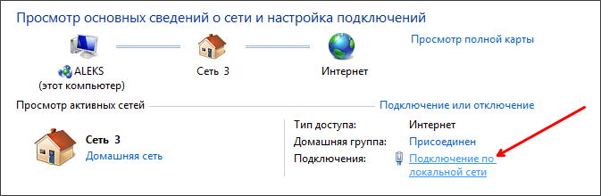 После того как вы откроете окно «Центр управления сетями и общим доступом» вам нужно кликнуть по ссылке «Подключение по локальной сети».