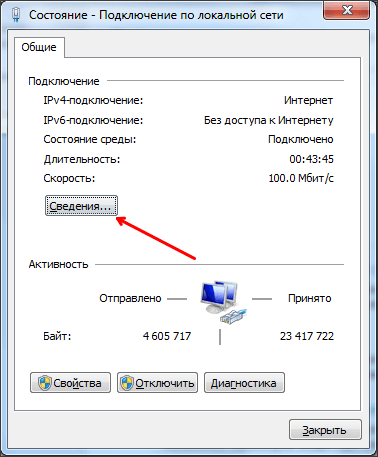 После этого перед вами откроется окно с информацией о данном сетевом подключении.