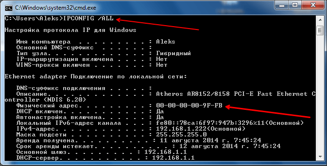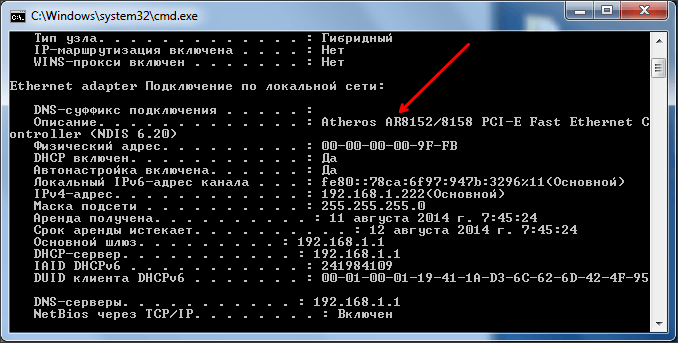 Используя IPCONFIG /ALL нужно быть внимательным, поскольку данная команда выводит информацию сразу обо всех подключениях, у каждого из которых есть свой MAC адрес. Для того чтобы не запутаться легче всего ориентироваться на название сетевой карты, оно указано в поле «Описание».