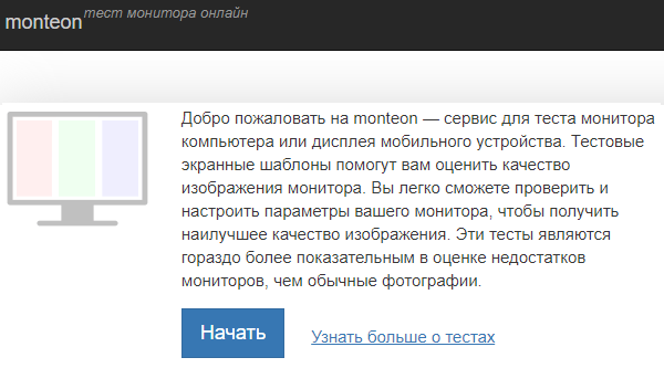 Самый удобный сайт для проверки монитора на битые пиксели — это http://monteon.ru, рекомендуем использовать именно его. После открытия данного сайта вы увидите кнопку «Начать». Нажмите ее для того чтобы начать проверку.