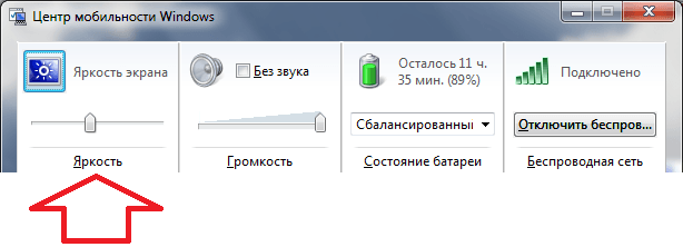После этого перед вами должно открыться окно «Центра мобильности Windows». Для того чтобы сделать ярче экран на ноутбуке вам нужно просто переместить ползунок яркости вправо. Уменьшение яркости выполняется аналогичным способом.