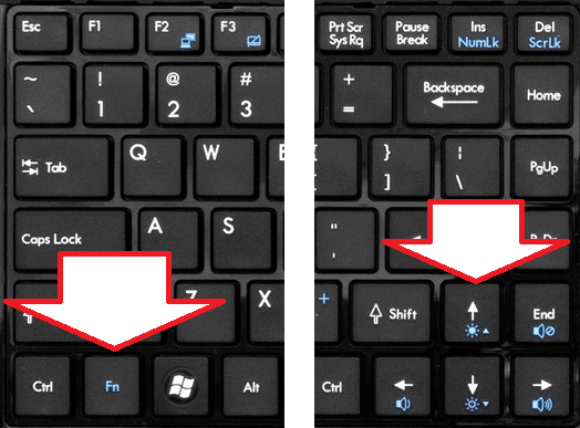 Большинство производителей ноутбуков предусматривают возможность управления яркостью экрана при помощи комбинаций клавиш. Обратите внимание на вашу клавиатуру, там, скорее всего, есть клавиши, на которых кроме обычных знаков есть изображение в виде солнца. Эти клавиши и используются для управления яркостью экрана на ноутбуке. Но, их нужно нажимать вместе с клавишей Fn, которая обычно располагается в левой нижней части клавиатуры.