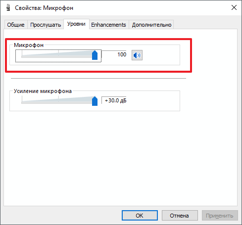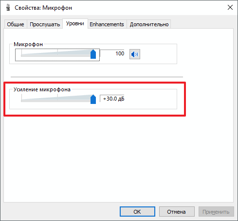 А параметр «Усиление микрофона» отвечает за усиление звука. Его используют тогда, когда стандартной громкости микрофона не хватает. Данный параметр можно выставить на значение +10, +20 или +30 дБ. В большинстве случаев для нормальной работы микрофона достаточно +10 или +20 дБ. Значение +30 дБ стоит использовать только в крайнем случае, если микрофон работает совсем тихо, поскольку при использовании такого большого усиления в звуке могут появляться искажения и помехи.