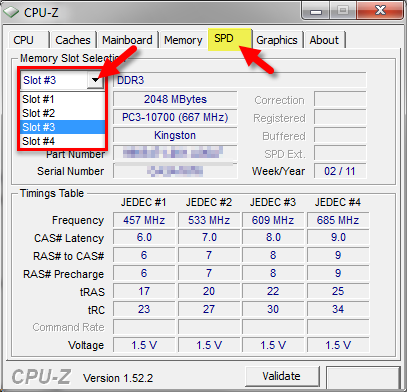 Извлеките все модули памяти, почистите их контакты стирательной резинкой, затем очистите их спиртом. Установите планки на место и проверьте, все ли они определяются системой. Это удобно сделать в бесплатной программе CPU-Z. Перейдите на вкладку SPD. В левой части окна есть выпадающий список, отображающий информацию об установленных планках RAM в каждом слоте: