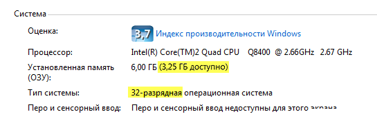 Из-за этих двух причин, порой бывает достаточно сложно понять, почему доступен именно такой объём оперативной памяти. Ведь может получиться, что из 6-ти установленных гигабайт 32-битная Windows «увидела» 3,25 ГБ, а видеокарта «отрезала» из этого объёма ещё 512МБ. В итоге, в свойствах системы будет написано 6ГБ (доступно 2,73). Решением такой комбинированной проблемы будет опять же замена операционной системы на 64-битную и, если нужно, наращивание ОЗУ.