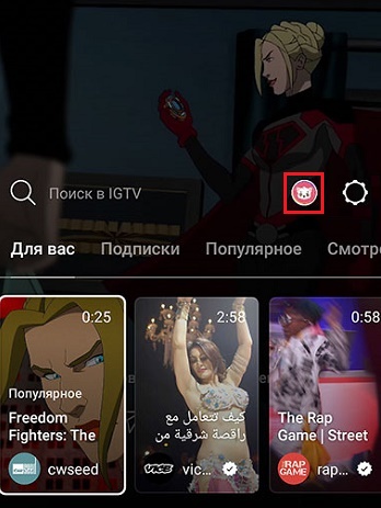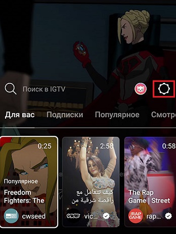 Нажмите на кнопку с изображением телевизора - Откроется функционал раздела «IGTV». Здесь нажмите справа сверху на значок с шестерёнкой;