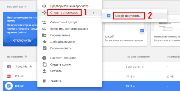 - Щелкните на нем ПКМ и выберите пункты «Открыть с помощью» – «Google Документы».