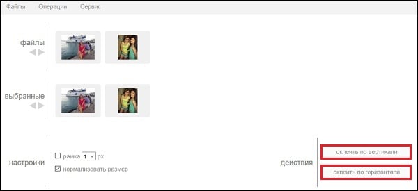 Используйте вкладку «Файл» для загрузки фото на ресурс - Выберите вкладу «Операции» — «Редактировать» — «Склеить несколько фото»;