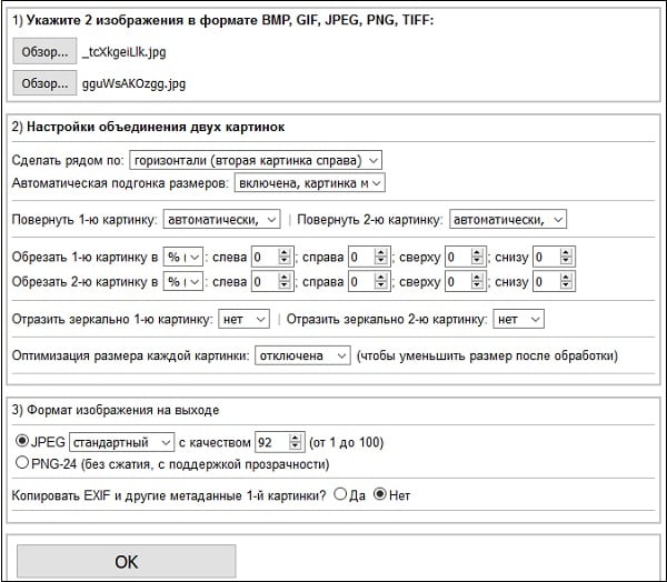 - Нажмите внизу на «Ок» для запуска процесса склейки фото онлайн;