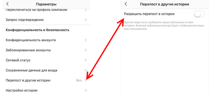 Отключение перепоста в Инстаграм - И в следующем окне передвинуть ползунок в режим «Не активно».