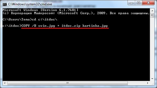 - Затем введите следующую команду: «COPY /B название изображения + имя архива название картинки, которая получится на выходе» (без кавычек) и щелкните Enter. В моем примере получится так: COPY /B svin.jpg + itdoc.zip kartinka.jpg (не забудьте о пробелах между названиями).