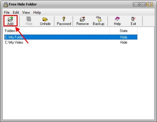 - Чтобы спрятать папку на ноутбуке или флешке, кликните кнопку «Add» («Добавить») и укажите, где она находится.