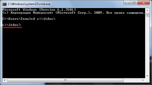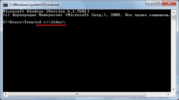 - Запустится командная строка – надо открыть в ней папку, прописав в ней команду cd c:itdoc (вместо «itdoc» введите ваше название, плюс обязательно нужны две вертикальные палочки – слеши).