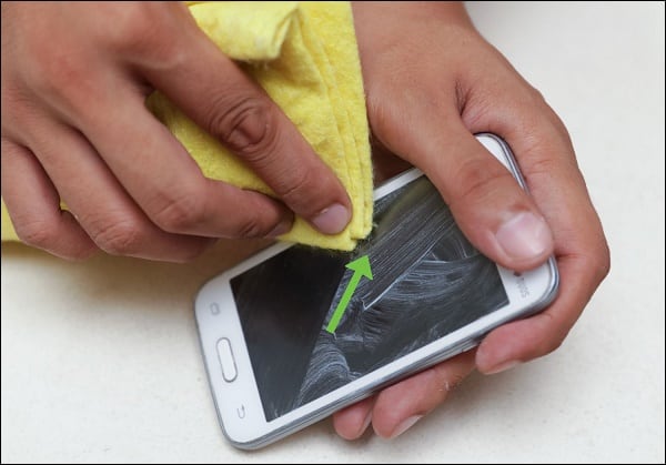 - Аккуратно втирайте ткань с пастой круговыми движениями на экране в месте нахождения царапины до тех пор, пока не увидите, что повреждение исчезло.