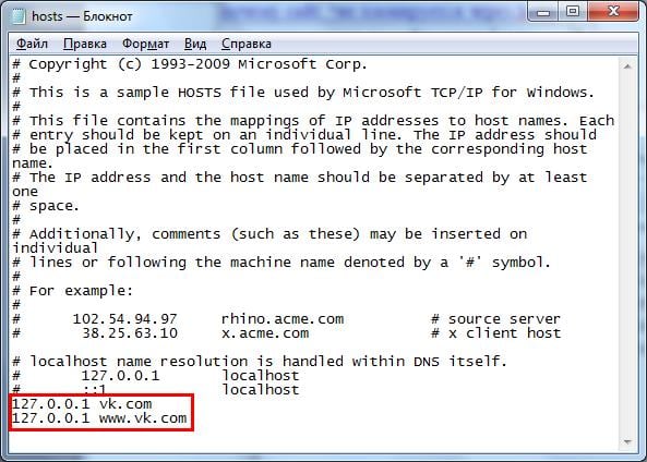 Блокировка сайта через hosts осуществляется следующим образом: с новой строчки нужно написать 127.0.0.1, затем поставить один пробел и написать адрес веб-ресурса – например, vk.com.