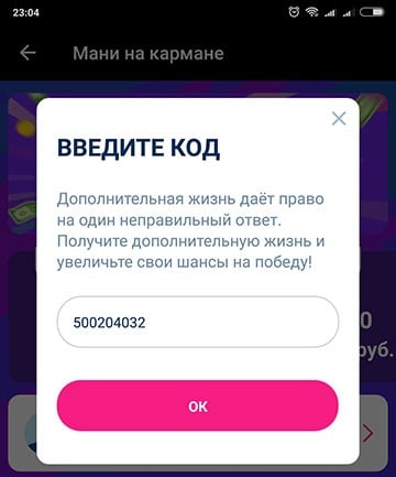 Ввод кода подарит игроку одну дополнительную жизнь - Активируйте напоминание о предстоящей игре (работает единожды). Задействовав напоминание о предстоящей игре (игра происходит в 15 и 19 часов каждый день) вы получите дополнительную жизнь, дающую вам право на ошибку в игре;