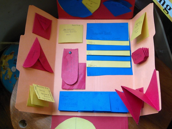 Затем нарисуйте на бумаге, вырежьте и наклейте составляющие лэпбука – кармашки, конверты, вращающиеся круги, книжечки (в том числе книжки-гармошки), блокноты.
