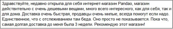 Стоит ли покупать на Пандао? Я думаю, да. Но будьте готовы, что купленный вами товар может идти месяцами, а техподдержка не будет демонстрировать желание с вами общаться. Но в некоторых случаях покупки на Пандао дают возможность существенно сэкономить, потому если не хотите переплачивать – воспользуйтесь данным интернет-магазином, а затем напишите свой личный отзыв. Удачных покупок на Пандао.