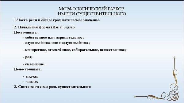 Также при разборе нужно помнить, что в разных предложениях имя существительное может играть различную синтаксическую роль, а значит нужно учитывать его постоянные и непостоянные морфологические атрибуты.