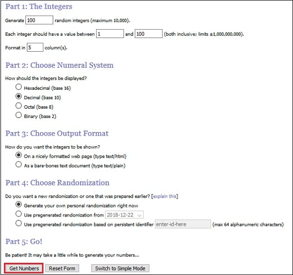Богатство настроек на random.org - В части 2 (Part 2) выберите систему, числа в которой вы хотите получить. Hexadecimal – шестнадцатиричная, Decimal – десятичная, Octal – восьмеричная, Binary – двоичная;