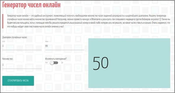 Последним в нашем списке генераторов незакономерных чисел в сети Интернет мы отметим сервис generator-online.com. Данная программа обладает упрощённой функцией вычисления и подойдёт тем пользователям, которые не хотят «заморачиваться» множеством различных настроек.