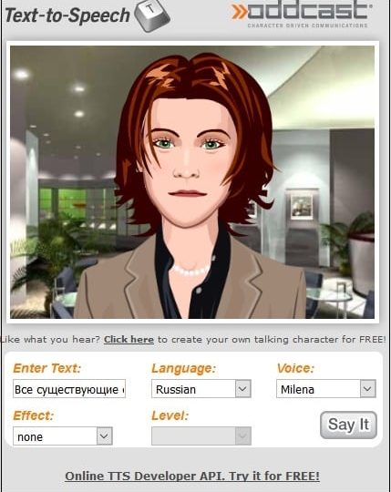 Англоязычный сервис oddcast.com может похвастаться имеющимися в его функционале тремя русскими голосами (Dmitri, Milena, Olga), а также приятной визуальной составляющей. При этом воспроизводимые сервисом голоса звучат довольно роботизированно, ударения в словах часто ставятся невпопад. Количество бесплатно воспроизводимых предложений ограничено парой сотен символов (за большее придётся доплачивать).
