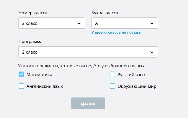 - В последней форме введите номер класса, букву, учебную программу (соответственно классу) и предметы, по которым будут проходить занятия. Для продолжения нажмите кнопку «Далее».