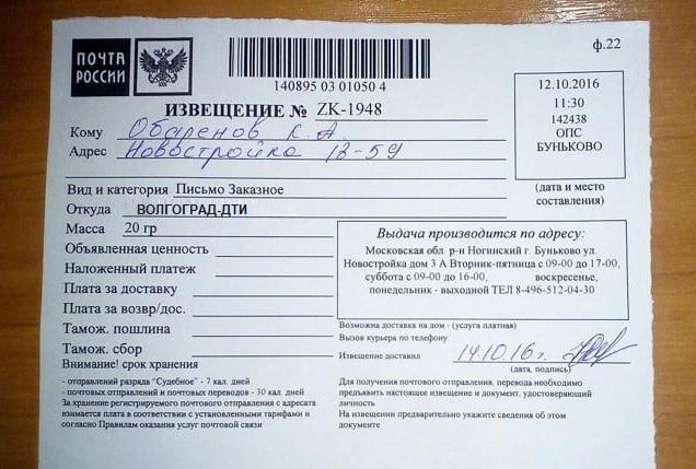 Таким образом, мы не можем определить откуда оно пришло и что это за письмо Волгоград ДТИ, пока не получим само письмо. Для этого вам необходимо появиться в почтовом отделении, взяв с собой извещение и документ, подтверждающий вашу личность.
