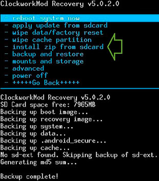 - Выделить «install zipfrom sd card» и нажать физическую клавишу «Домой» на девайсе либо клавишу «Вкл./Откл.»;