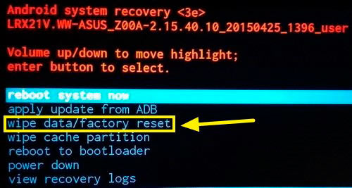 - Указать «wipe data/factory reset» (осуществляется с помощью клавиш громкости);