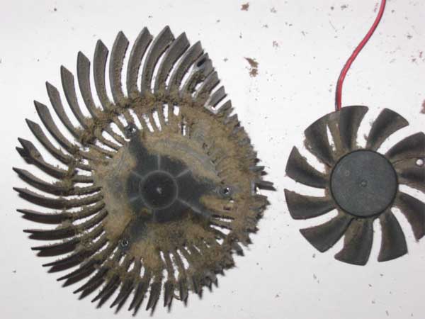 Откручиваем вентилятор от радиатора и чистим щеткой все это дело от пыли.