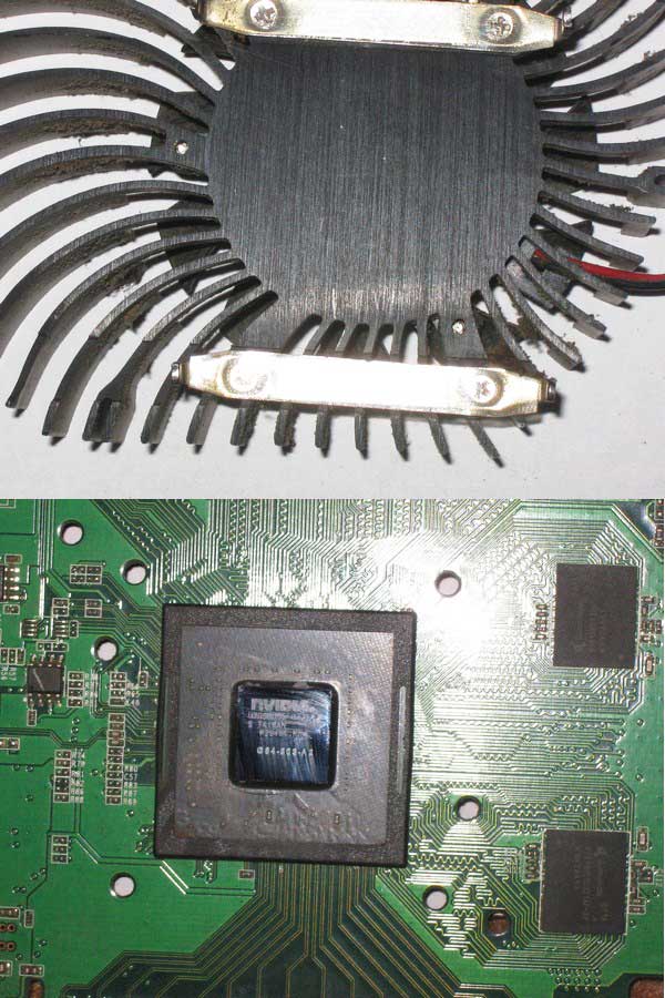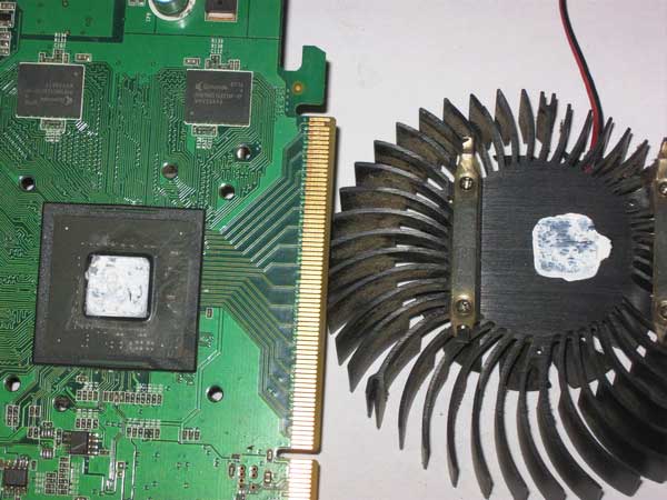 Опосля чего, с помощью ватного диска , жидкостью для снятия лака (я пользовался именно ней) или спиртом, смываем остатки старой термопасты с радиатора и чипа видеокарты .