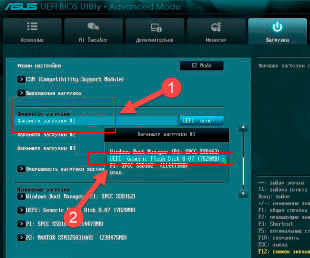 - Указать внешний носитель с образом Виндовс в качестве устройства под номером «1», а под номером «2» установить жесткий диск;
