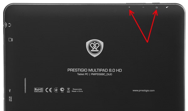 - Например, на популярном Prestigio MultiPad 8 это можно сделать так: нажмите одновременно кнопку «Power» и увеличение громкости;