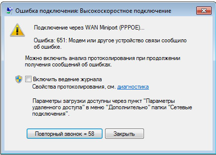 Наиболее популярная неприятность – ошибка 651 при подключении к интернету Windows 7.