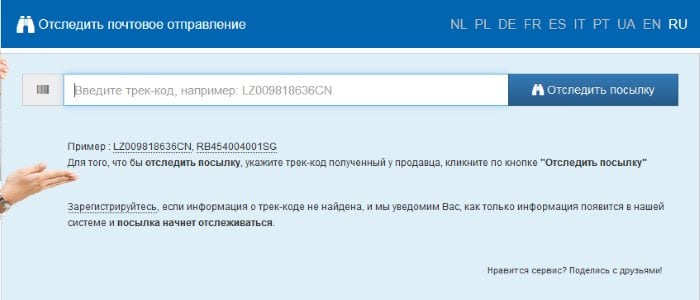 - Перед собой вы увидите строку, в которую нужно ввести трек-код, получить его можно у продавца или на сайте в личном кабинете;