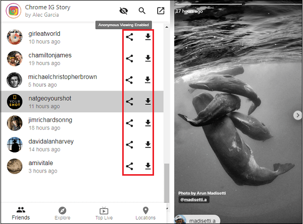 - После прохождения процедуры авторизации в окне расширения будут выведен перечень сторис ваших друзей с двумя кнопками справа.