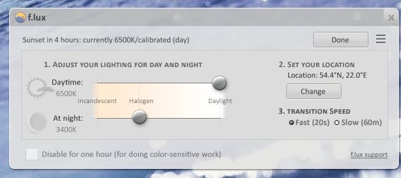 f.lux работает по принципу «установил и забыл», т.е. программа не требует ручного вмешательства пользователя, и все ее функции полностью автоматизированы: она сама обнаружит ваше географическое положение и приспособит себя к местному времени. Конечно, доступны опции и для ручного выбора местоположения, тонкие настройки для регулировки цветовой температуры и интервал для динамического изменения тона.