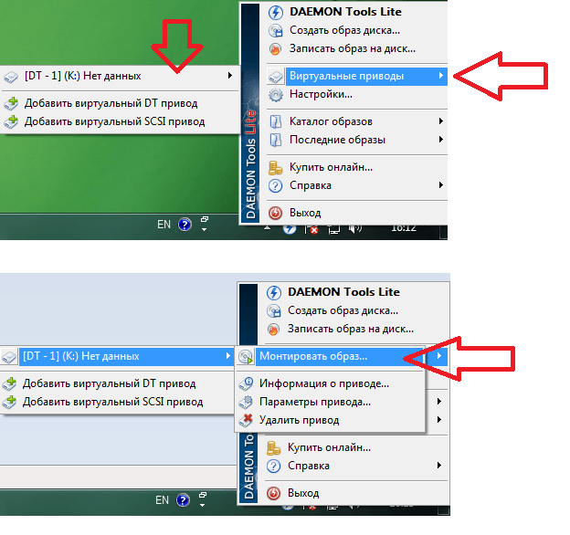 Для того чтобы смонтировать образ диска нажмите правой кнопкой мышки на иконке программы в области уведомлений панели задач. В открывшемся окне выберите пункт Виртуальные приводы – Монтировать образ. После этого вам откроется обычно окно для выбора файла. Здесь необходимо выбрать файл образа диска, который вы хотите смонтировать. Все, после этого появится сообщение «Монтирование образа» и через несколько секунд диск станет доступен в виртуальном приводе. Для того чтобы в это убедиться откройте окно «Мой компьютер» и найдите новый диск.
